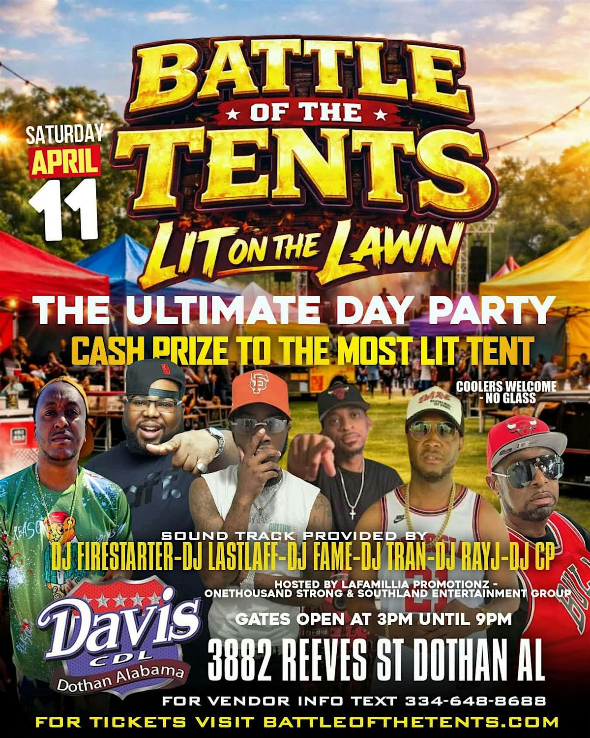 Lafamillia Promotionz, Onethousand Strong, and Southland Entertainment Group present Battle of the Tents: Lit on the Lawn! This isn't just a party—it’s a high-stakes showdown to see who really runs the city. We’re turning the lawn into a sea of style, luxury, and pure energy, and we want YOU to be a part of it.