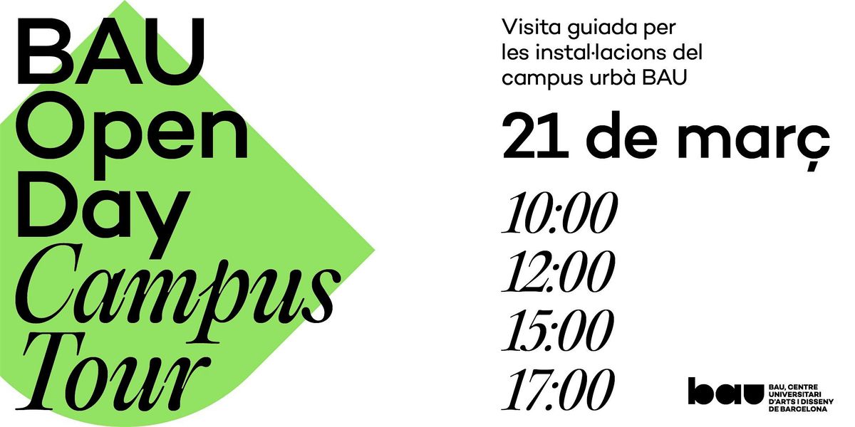 BAU celebrarà dissabte que ve 21 de març el BAU Open Day Campus Tour. Durant les visites es recorreran els tres edificis del campus urbà de BAU—Pujades, Llacuna i Granada—, així com els seus espais, serveis i tallers, per a conèixer el dia a dia a BAU i rebre més informació dels diferents estudis disponibles.