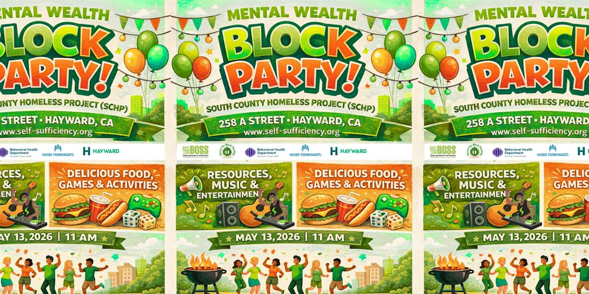 Join us for community wellness and healing on May 13, 11 am to 3:00 pm for our Mental Wealth Block Party @ BOSS' South County Homeless Project, 258 West A Street, in Hayward. This is a FREE FAMILY-FRIENDLY event with partner organizations collaborating to get the community connected to the services and resources they need to lead more productive lives.