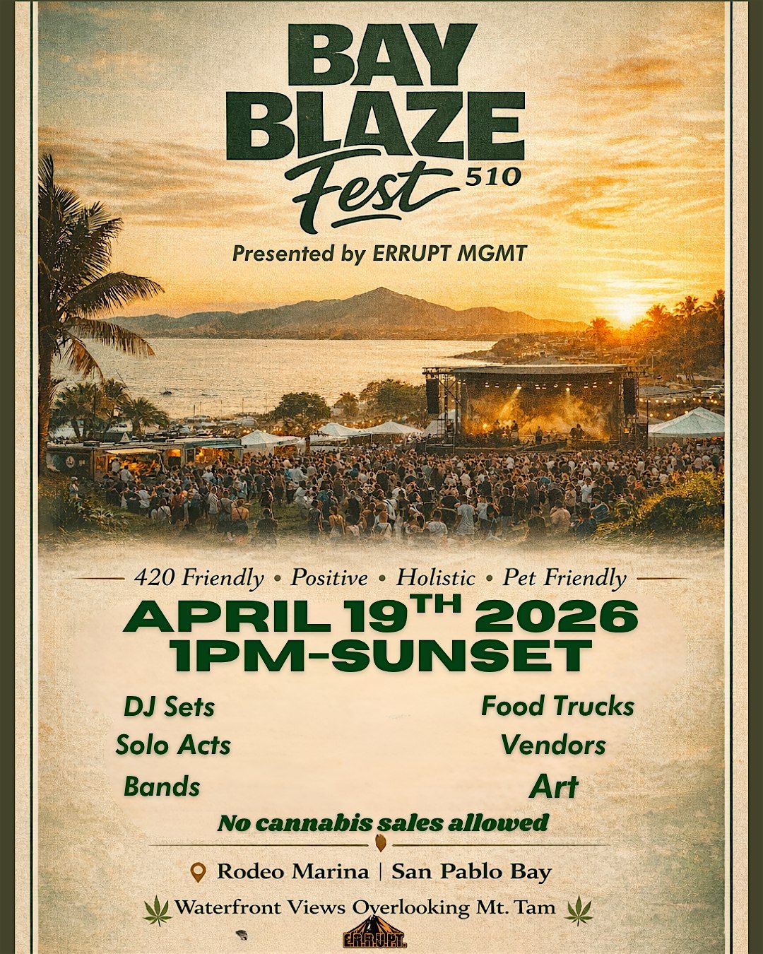 Bay Blaze Fest is a 420-friendly waterfront celebration of music, culture, and conscious living — set against the stunning backdrop of Rodeo Marina, overlooking San Pablo Bay with views of Mt. Tam.