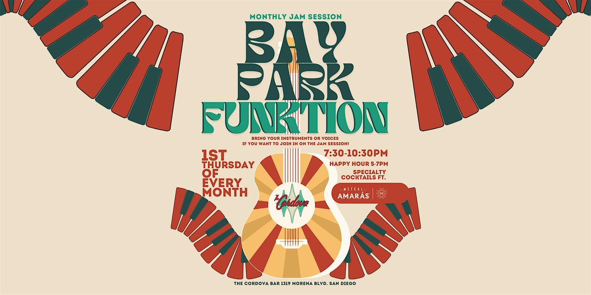 San Diego funkateers: Join us for our monthly funk jam at Cordova! Expect some serious funk vibes and good times. Bring your instruments if you would like to join in on the jam session! Bay Park Funktion takes place at The Cordova Bar every First Thursday of the month from 7:30-10:30pm! Happy Hour specials 5-7pm.