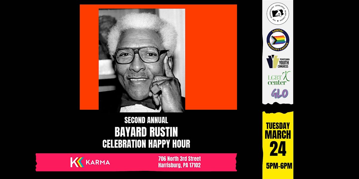 Please join the Pennsylvania Legislative Black Caucus, the LGBTQ+ Equality Caucus, the Pennsylvania Youth Congress, and the LGBT Center of Central Pennsylvania in a celebration happy hour for Bayard Rustin's birthday at Karma. A PA House Resolution honoring his life is planned for passage in by the PA House the following day, March 25th.