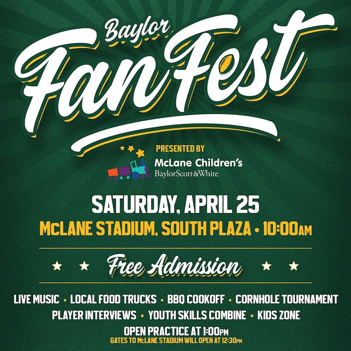 Fan Fest will also feature a kids zone with inflatables, a uniform try-on station, photo opportunities with Baylor Spirit and mascots, a coloring station and face painting.