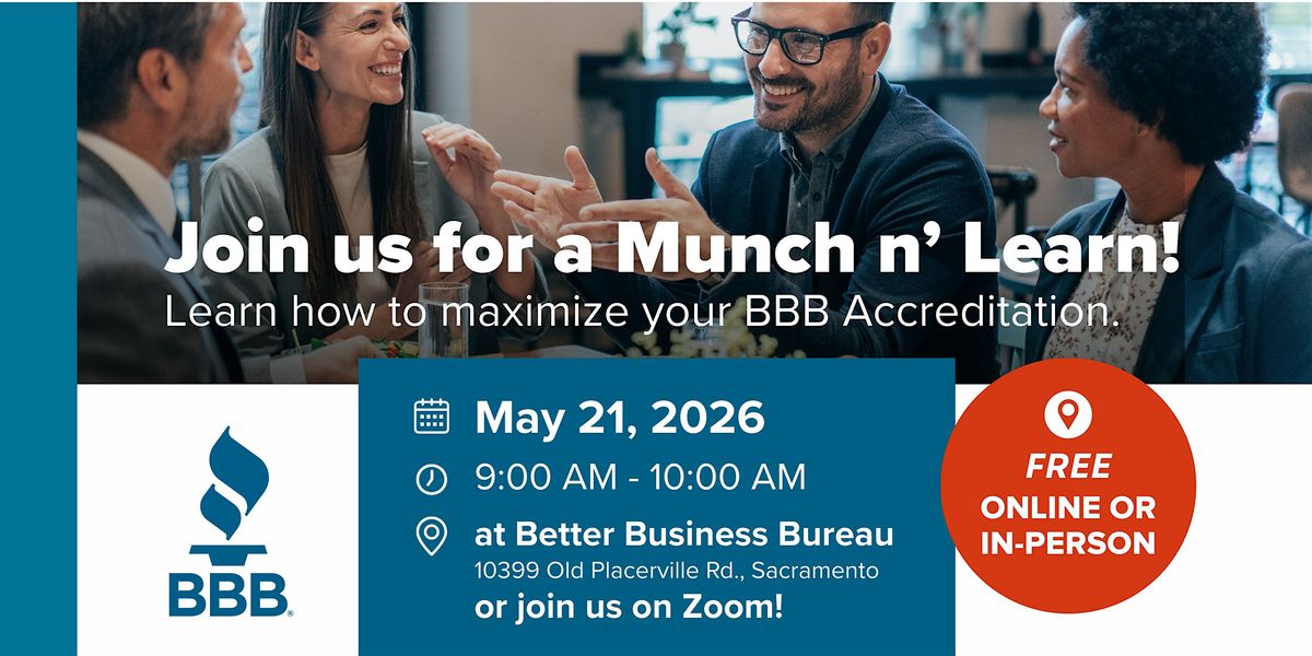 Are you a BBB member looking to get more from your accreditation? Then join us for our next interactive Munch & Learn on May. 21st, designed to help you get the most from your membership.