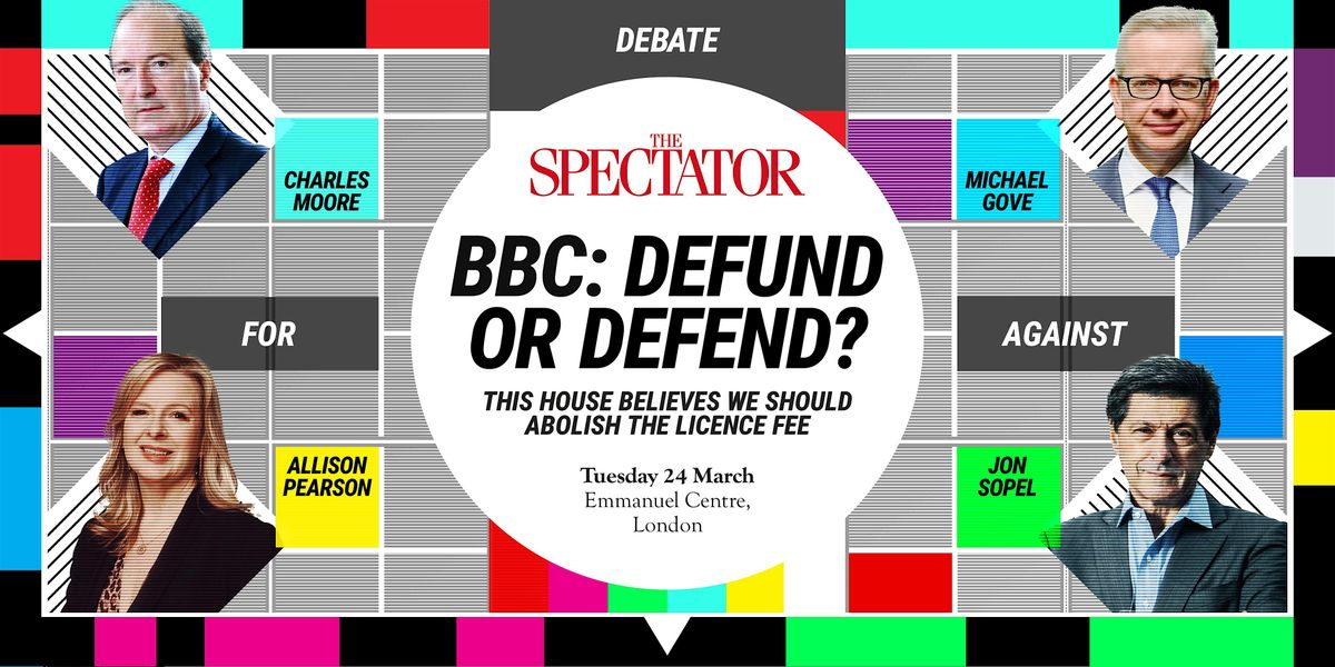 So is the BBC still a vital public service that ‘educates, informs, and entertains’ the nation – or a relic from the past? Watch The Spectator’s Charles Moore, who was fined after refusing to pay his licence fee, and the Telegraph’s Allison Pearson go up against Spectator editor and former BBC journalist Michael Gove and former BBC America editor Jon Sopel at this very special event.