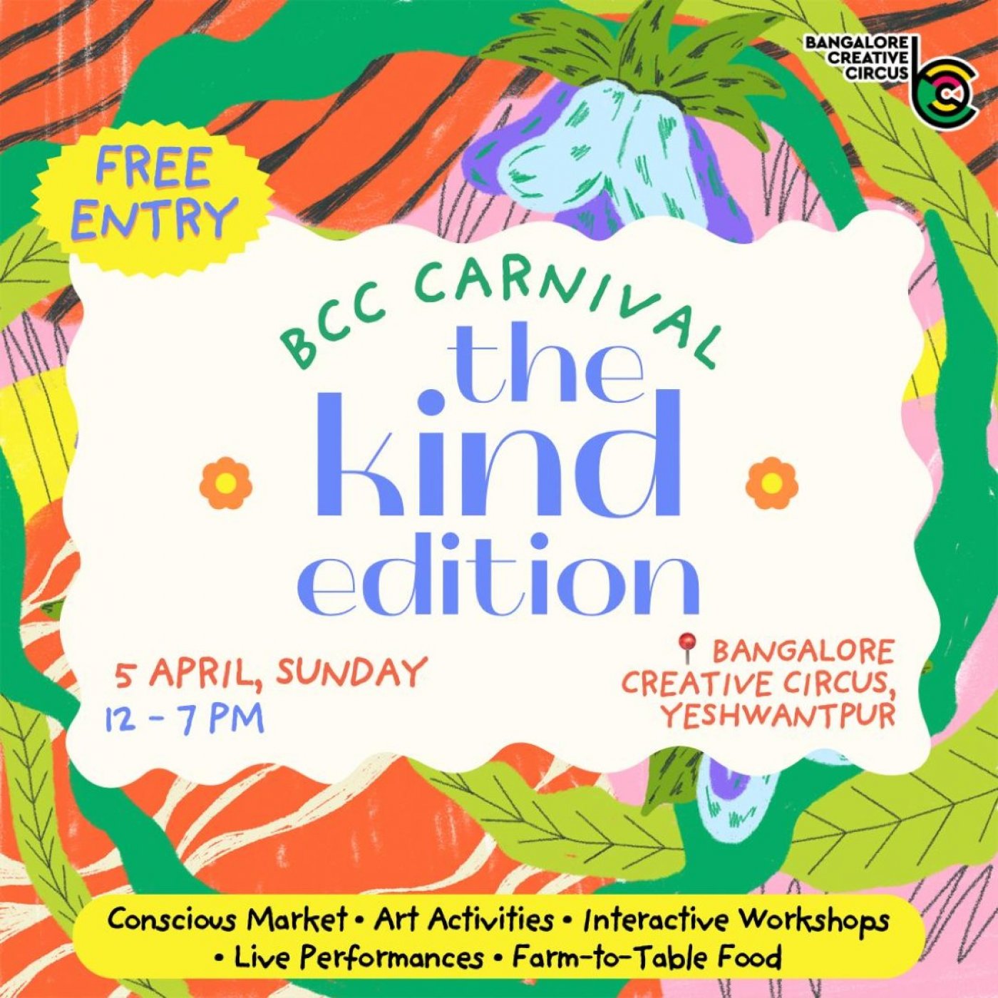 The BCC Carnival is a monthly gathering that has been hosted by Bangalore Creative Circus on the first Sunday of every month since February, 2022. It is a monthly celebration of conscious community and local changemakers, often exploring different themes and causes. The next one on 5th April is The Kind Edition, celebrating ways of living that are kinder to nature, animals, and humanity.