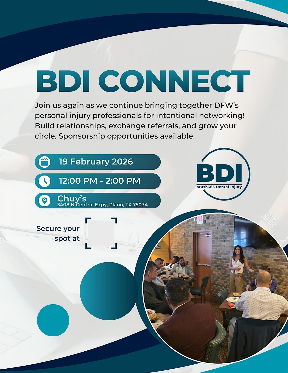 BDI Connect Lunch is a fun, high-value, in-person meetup to network, connect, and enjoy great food with professionals across the personal injury industry.Join us for BDI Connect, a monthly curated lunch designed to bring together attorneys, medical providers, case managers, and PI service partners in a relaxed yet business-focused setting—without the noise or pressure of after-hours events.