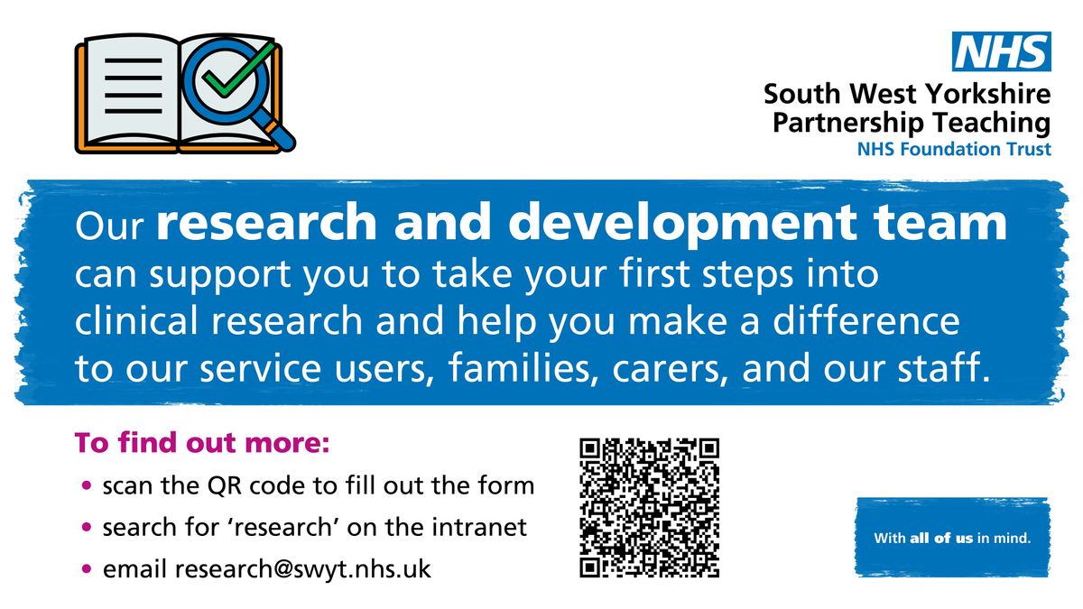 This event is aimed at Trust services and staff who are/have been previously involved in research studies with the SWYPT Research & Development department over the last few years. It is also aimed at service staff and managers who would like to get involved in research but are unsure how to. Our aim is to showcase how services can get involved in studies, and how the R&D team can support you throughout the process. Also to make staff and services aware of what research is about, what it involves and what is expected of them when becoming involved. Throughout the day there will be speakers and presentations from some of the services that are involved with studies. You can attend the whole day, or part of the day (please indicate when you register). There will be refreshments throughout the day and a free lunch. An Agenda will follow shortly.