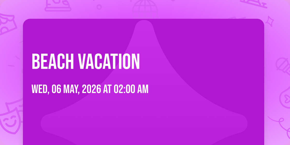 📍 Location: 35.0847, -106.655🌟 Be part of history at Beach Vacation, an extraordinary gathering that will captivate your imagination! 🏛️ The prestigious Launchpad in Albuquerque, NM sets the stage for an unforgettable experience on May 6th, 2026 at 02:00 AM. ✨ They are bringing together the finest elements of entertainment and innovation to create moments that will take your breath away. From the moment you arrive, you'll be immersed in an atmosphere of wonder and excitement. 🎯 This carefully planned event ensures every guest experiences something truly special. 🎊 Early booking is recommended for this must-attend event of the season!