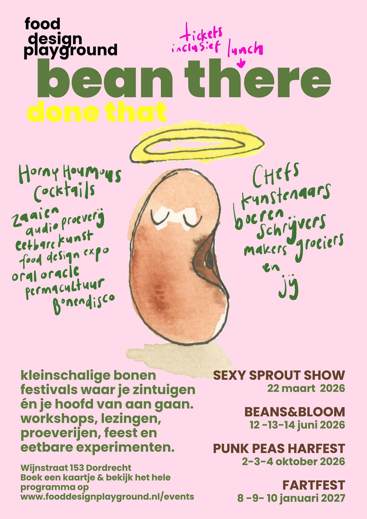 Een bonte mix van chefs, kunstenaars, boeren, schrijvers, makers en groeiers komt spelen met bonen. En jij proeft, speelt en verwondert mee. Samen onderzoeken en vieren we alles wat boon is (en zou kunnen zijn).