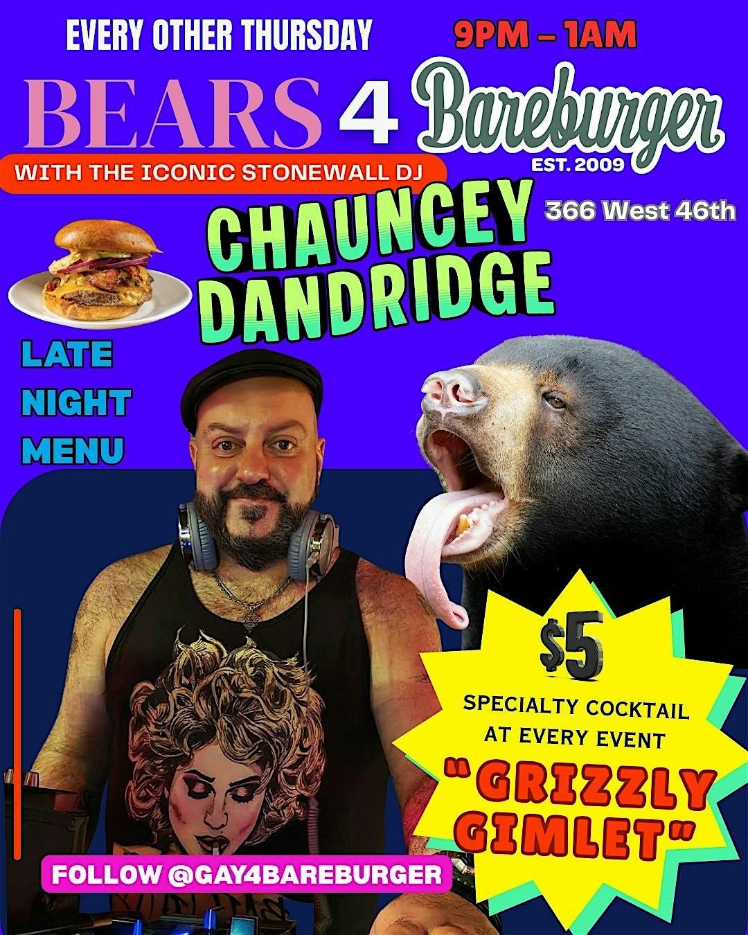 A late-night party for the bears and their admirers featuring DJ Chauncey Dandridge. A flirty vibe, late-night bites, and $5 Grizzly Gimlets