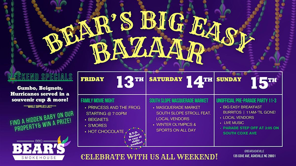 Let the good times roll at Bearās Smokehouse BBQ with a full weekend of Mardi Gras fun! Enjoy a family-friendly movie night, Masquerade Market with local vendors, festive cocktails, live music, beignets, gumbo, and the ultimate pre-parade party before the Mardi Gras parade kicks off on Sunday!