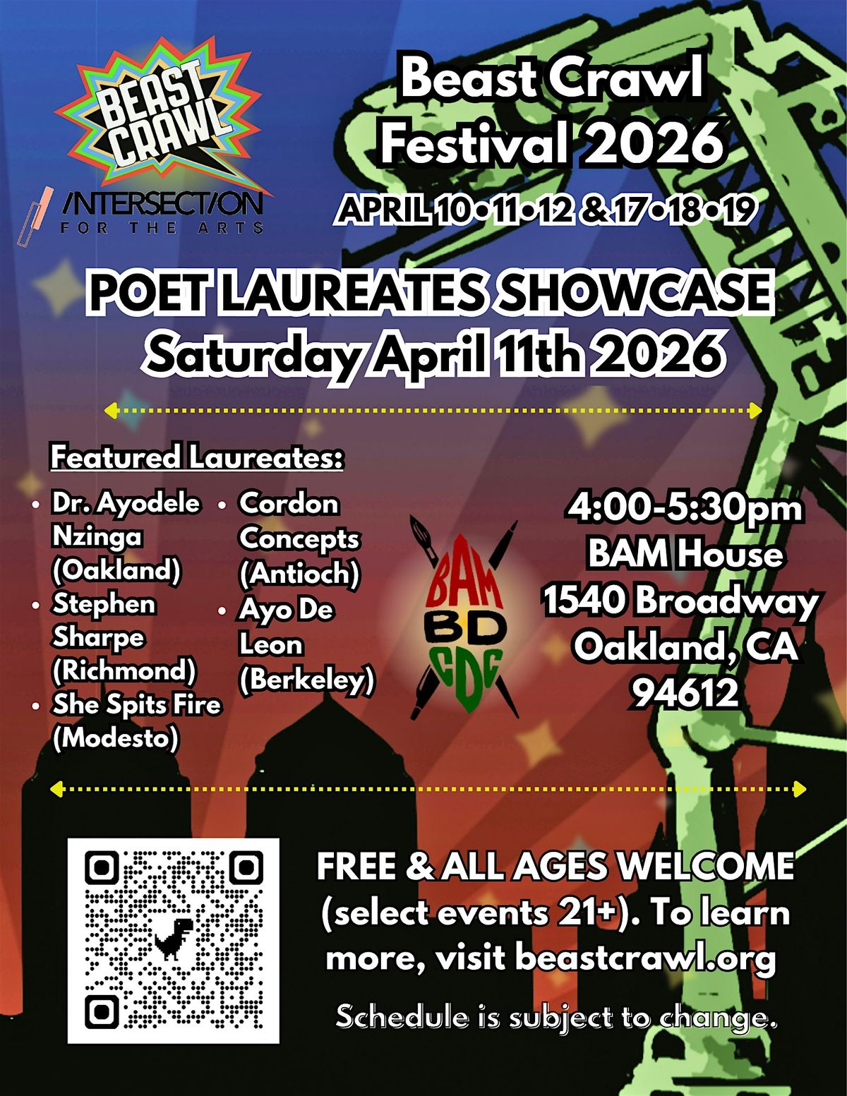 Join Beast Crawl Festival 2026 for a powerful afternoon of poetry, performance, and community at the Poet Laureates Showcase on Saturday, April 11, 2026, from 4:00–5:30 PM at BAM House, 1540 Broadway, Oakland, CA 94612. FREE EVENT.