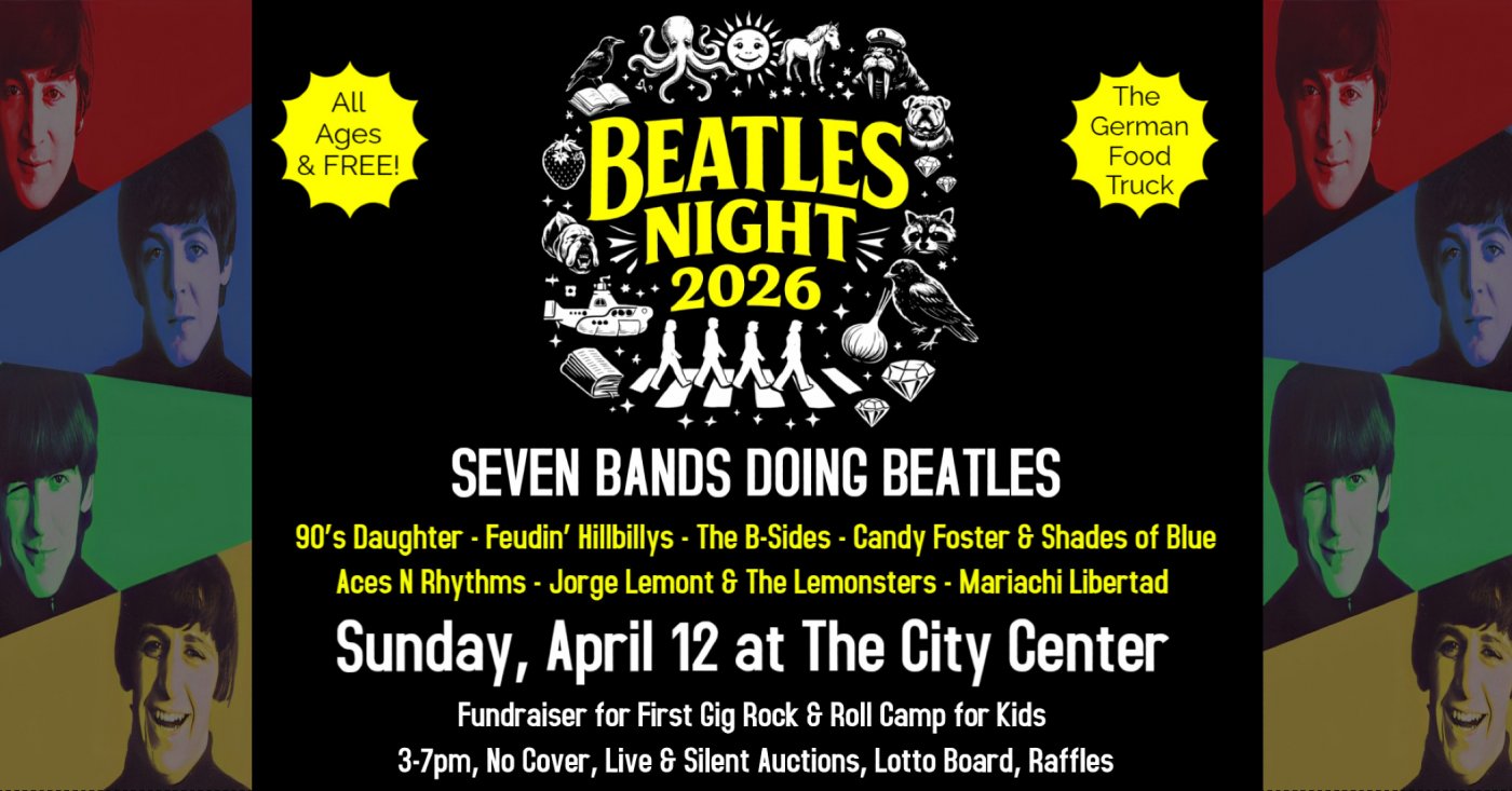 Seven bands all playing THE BEATLES! A free, all-ages fundraiser for First Gig Rock N Roll Camp for Kids in Champaign and Danville.