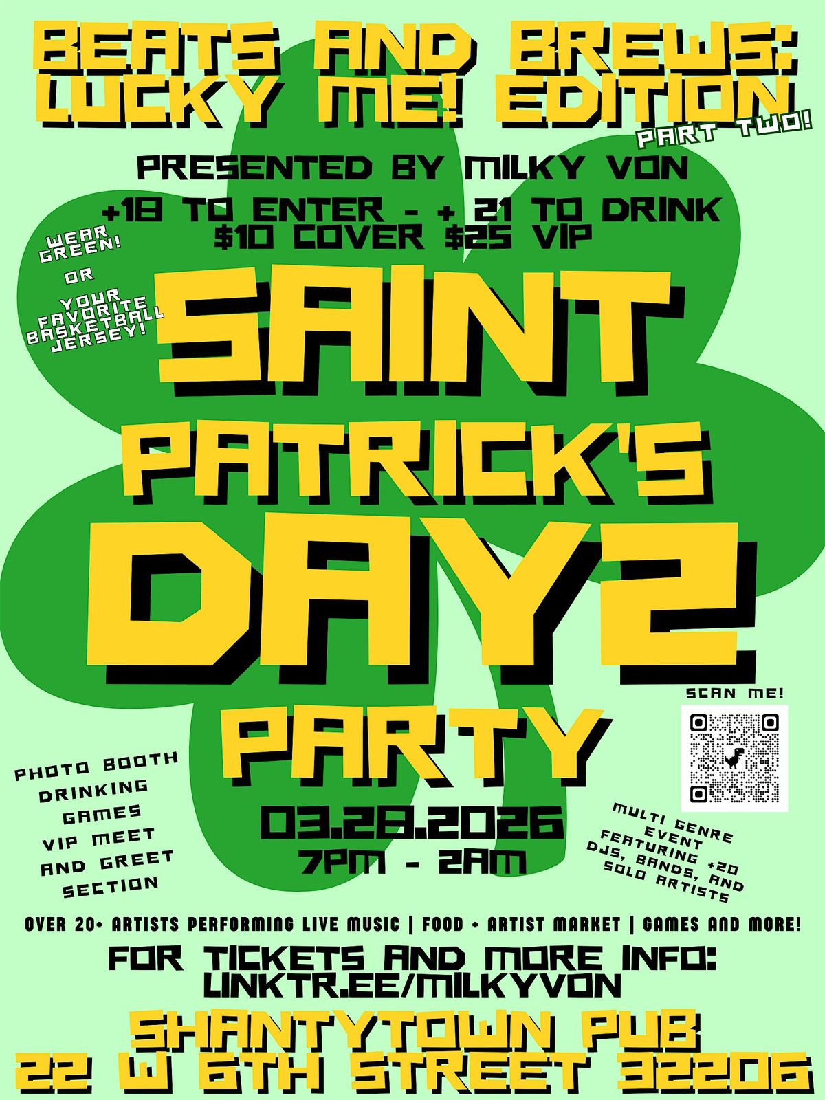 A Saint Patrick’s Day–inspired night of music, culture, and community energy returns with Part Two of Lucky Me! Presented by Milky Von, this multi‑genre takeover brings together DJs, bands, solo artists, creators, and party‑goers for a full‑scale celebration built around good vibes, good music, and good people.