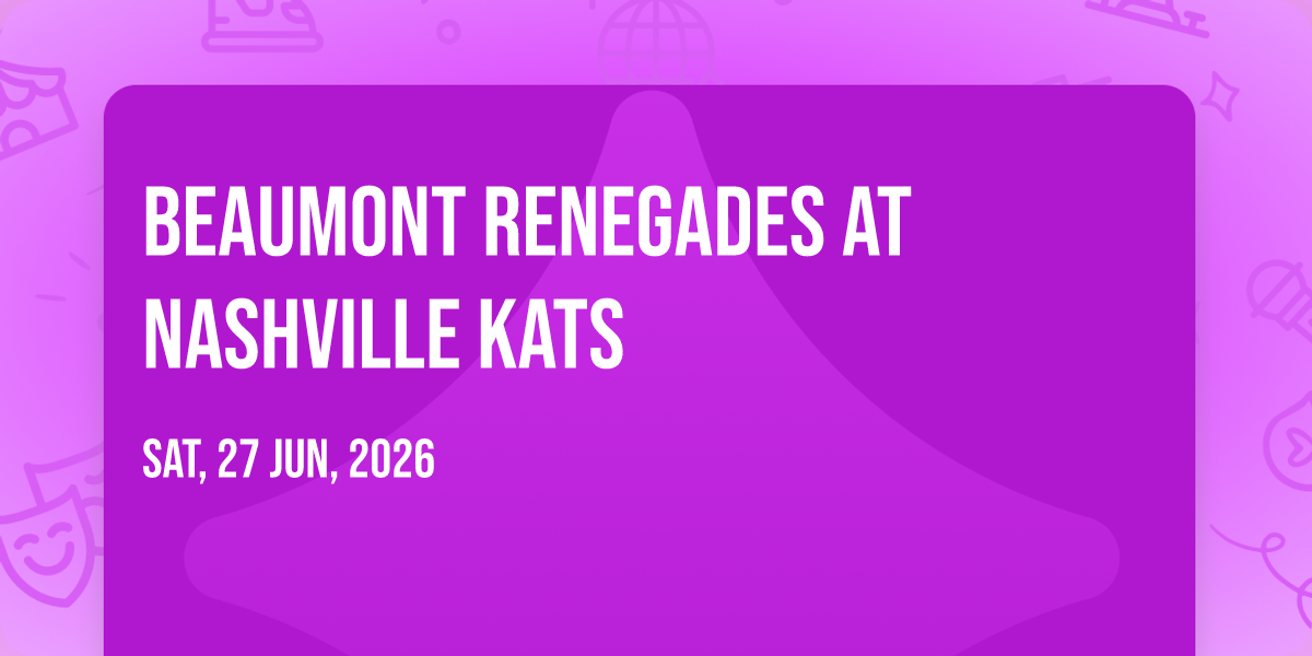 π Location: 36.5295, -87.3798π Welcome to Beaumont Renegades at Nashville Kats, where the impossible becomes possible and dreams take flight! ποΈ Join us at F&M Bank Arena in the heart of Clarksville, TN for an event that will redefine your expectations. π On June 27th, 2026 at 09:00 PM, witness the transformation of space and time into something truly magical. β¨ It's a curated experience combining the best of innovation, entertainment, and community spirit, creating moments that will be remembered for years to come. Whether you're a first-time visitor or a seasoned enthusiast, prepare to be amazed. π Book now to ensure your place in this unforgettable experience!