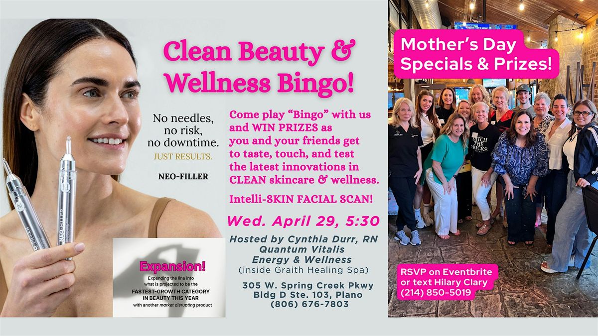 Come play “Bingo” with us and win prizes as you and your friends get to taste, touch, and test the latest innovations in holistic, clean skincare and wellness.
