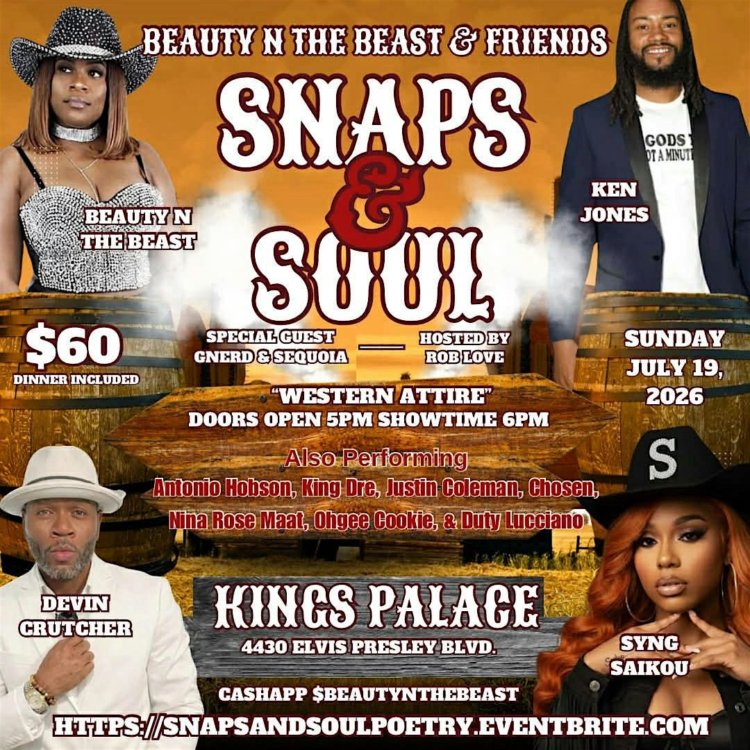 Get ready for a fun and chill evening at the King Palace Event Center! Join us on July 19, 2026 at 5:00 PM (Central Time) for Beauty N The Beast & friends “Snaps & Soul”. This show is hosted by the hilarious comedian Rob Love! Come throw on your boots , grab your fans and join us for a poetry meets soul indoor trail ride type of vibe. We will have Memphis finest Devin Crutcher and band serving you with the r and b and soul vibes. We have singer Syng Saiko blazing the stage with her beautiful soulful voice. The viral spoken word artist/ comedian Ken jones will have you snapping and laughing at the same time. The baddiest Saxophonist in Memphis Antonio Hobson got the 🔥 We got some special guest Lengendary GNerd Memphis jooker and Sequoia Watson hitting the floor with the line dances. Some of the best Memphis spokenword artist will be touching souls all night. Hungry? We have many dinner options included in your ticket price soul food (oxtails,lampchops, steak, salmon etc and vegan options. Bartender will have 2 for one specials all night. We have some amazing vendors for you to shop with. Dj Ea on the ones and twos. security will be enforfed. Come get your boots on the ground and enjoy an amazing soulful show. Western attire!!
