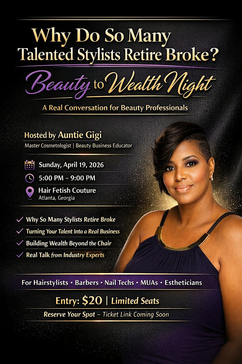 Beauty to Wealth Night is a networking and educational event designed for hairstylists, barbers, braiders, locticians, makeup artists, lash artists, and beauty entrepreneurs who want to learn how to turn their craft into long-term financial success.