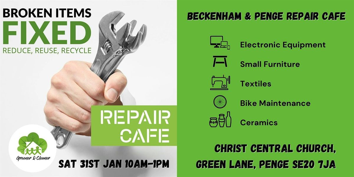 Welcome to the Beckenham & Penge Repair Cafe at Christ Central Church! Join us on Sat 31st January from 10AM for a fun and eco-friendly event. Bring your broken items and our skilled and experienced repair volunteers will help you fix them for free! Whether it's a wonky toaster, a wobbly chair or a moth holed jumper, we've got you covered. Let's reduce waste and learn new skills together. See you there!