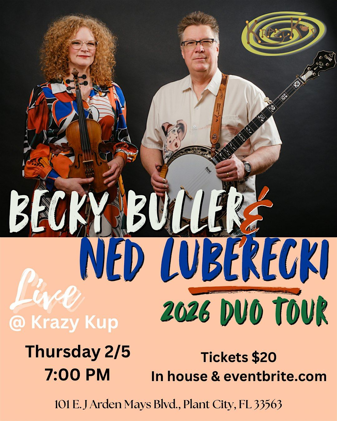 Ten-time IBMA award-winning songwriter, singer & fiddler Becky Buller and Banjo Hall Of Famer Ned Luberecki are bringing an evening of their delightfully delusional indiegrass roots music to YOU! Becky has written for many notable artists, including songs on three GRAMMY award-winning albums by Molly Tuttle, The Travelin’ McCourys, and The Infamous Stringdusters.