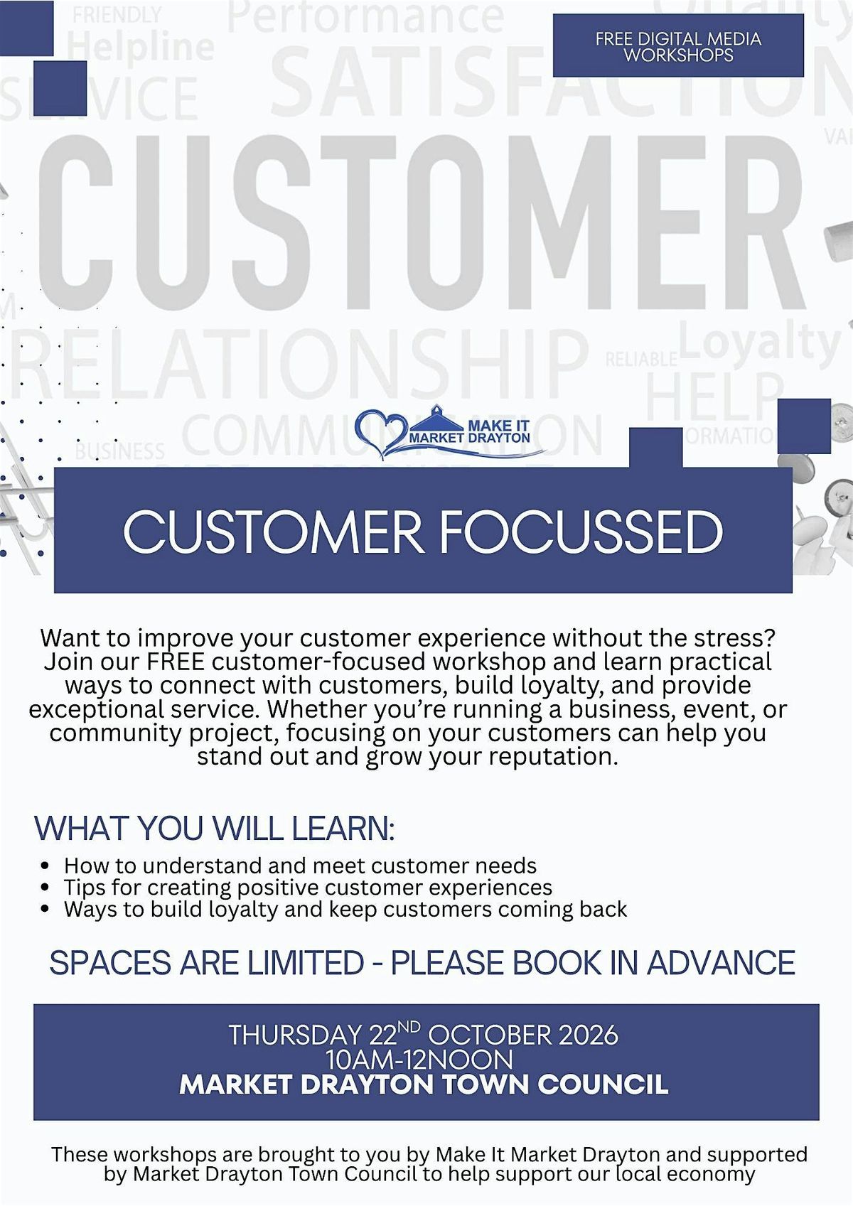 Want to improve your customer experience without the stress? Join our FREE customer-focused workshop and learn practical ways to connect with customers, build loyalty, and provide exceptional service. Whether you’re running a business, event, or community project, focusing on your customers can help you stand out and grow your reputation.