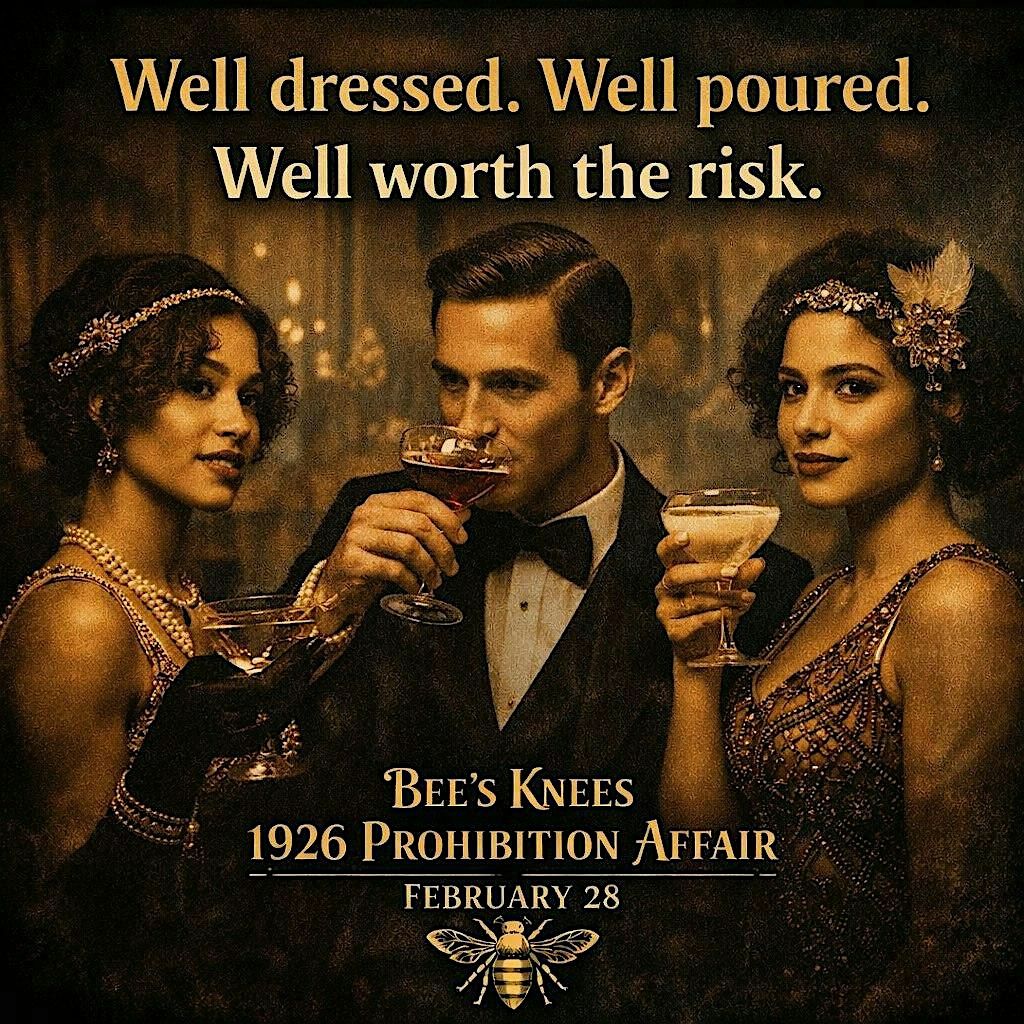 Step back in time and join us for a roaring good time at the Bee's Knees 1926 Prohibition Affair! Get ready for a night filled with vintage vibes, secret cocktails, and jazz tunes straight from the Roaring Twenties. Dress to impress in your best 1920s attire and enjoy an unforgettable in person experience that'll have you saying it's the bee's knees!