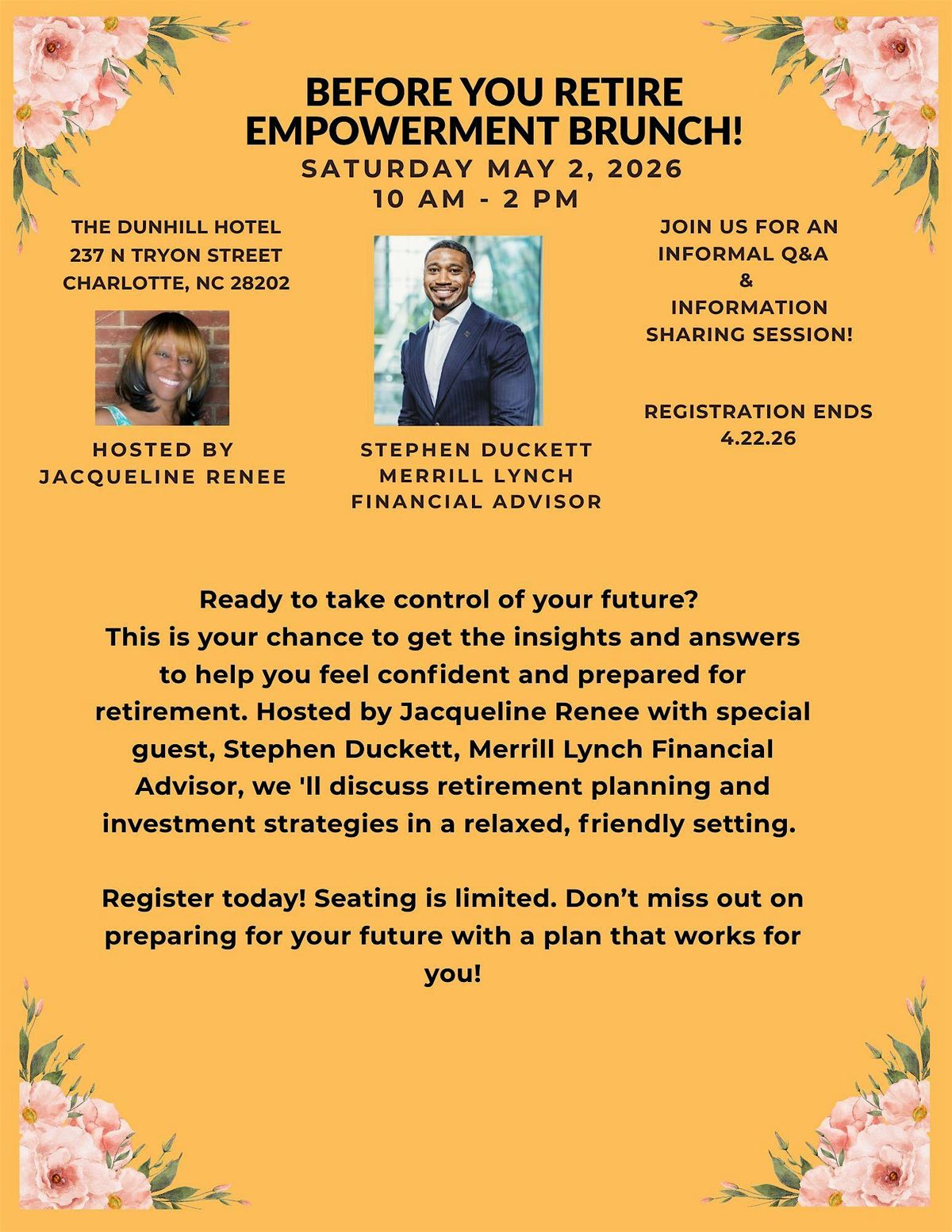 Ready to take control of your future? Join us in person for the Before You Retire Empowerment Brunch! This is your chance to get the insights and answers to help get prepared for retirement. Hosted by Jacqueline Renee with special guest, Stephen Duckett, Merrill Lynch Financial Advisor, we 'll discuss retirement planning and investment strategies in a relaxed, friendly setting. Your retirement future is counting on you!