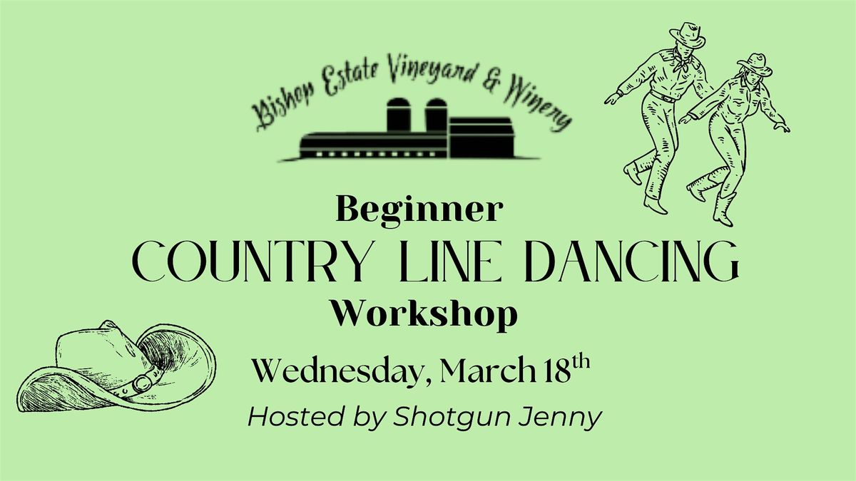 Come join us for a fun-filled night of beginner country line dancing workshop with the one and only Shotgun Jenny at Bishop Estate Vineyard and Winery! This event is perfect for those who are new to line dancing or want to learn the basic steps to a variety of popular country dances. No experience? No problem—this night is all about learning and having fun!