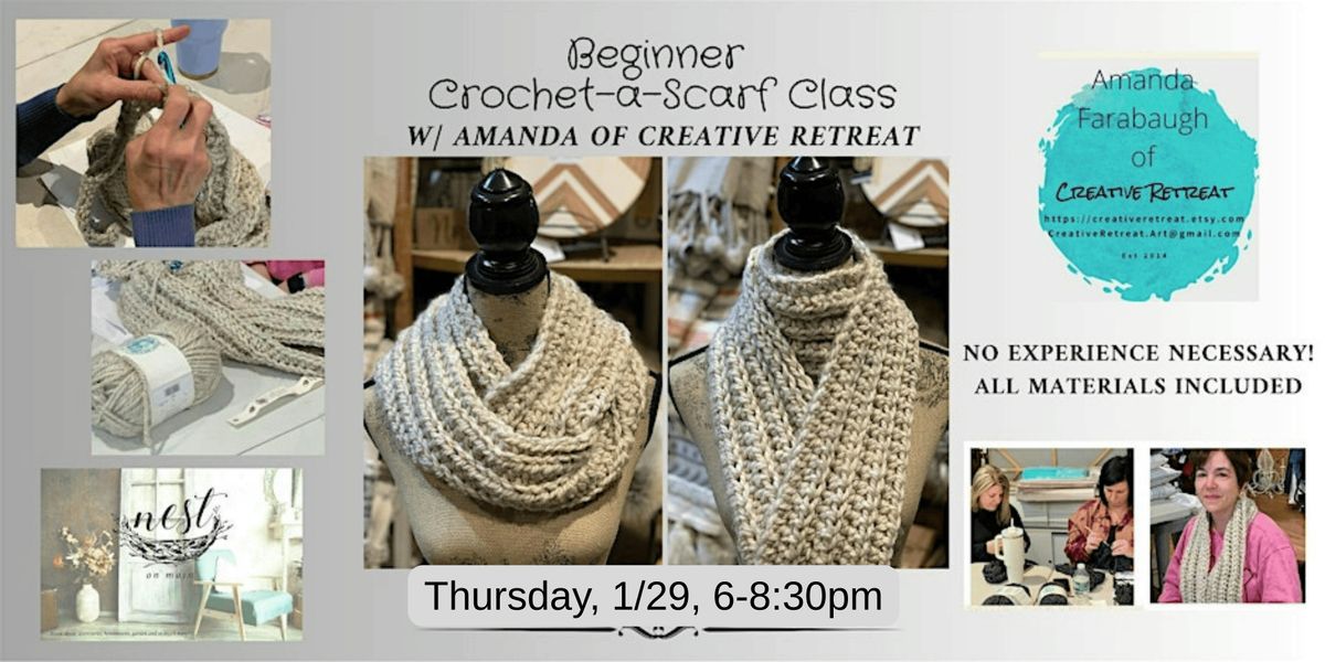 Get crafty and learn how to Crochet a Scarf with Amanda, of Creative Retreat. Students in this class will create a fun scarf that they will take home along with the crochet hook and pattern.