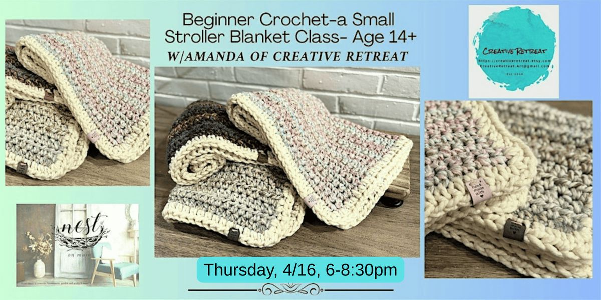During the class, each student will construct a small stroller blanket measuring approximately 24" by 22". Note, attendees may require more time to complete their projects at home after the workshop. Available yarn colors may vary due to supply and demand. All attendees will be given yarn, a crochet pattern, crochet hook, 2 stitch markers and "made with love" tag.