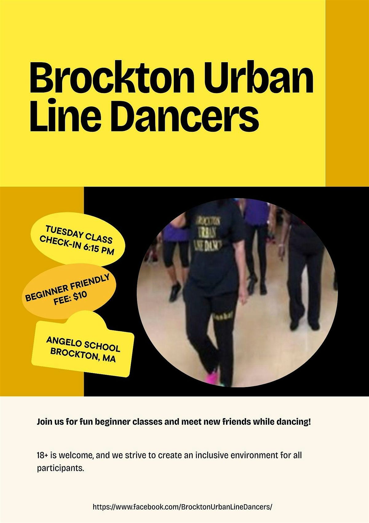 Announcements on our Facebook page here: https://www.facebook.com/BrocktonUrbanLineDancers