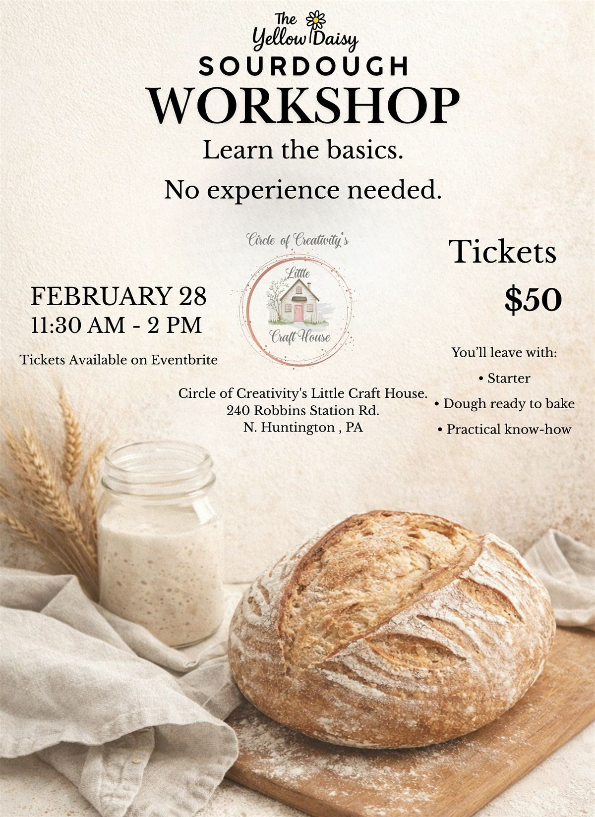 Our Beginner Sourdough Workshop is back by popular demand! Join The Yellow Daisy for a hands-on, beginner-friendly class at Circle of Creativity's Craft House . Learn the basics of sourdough, take home your own starter and dough to bake, enjoy light snacks. Limited to 10 participants for a relaxed, personalized experience.