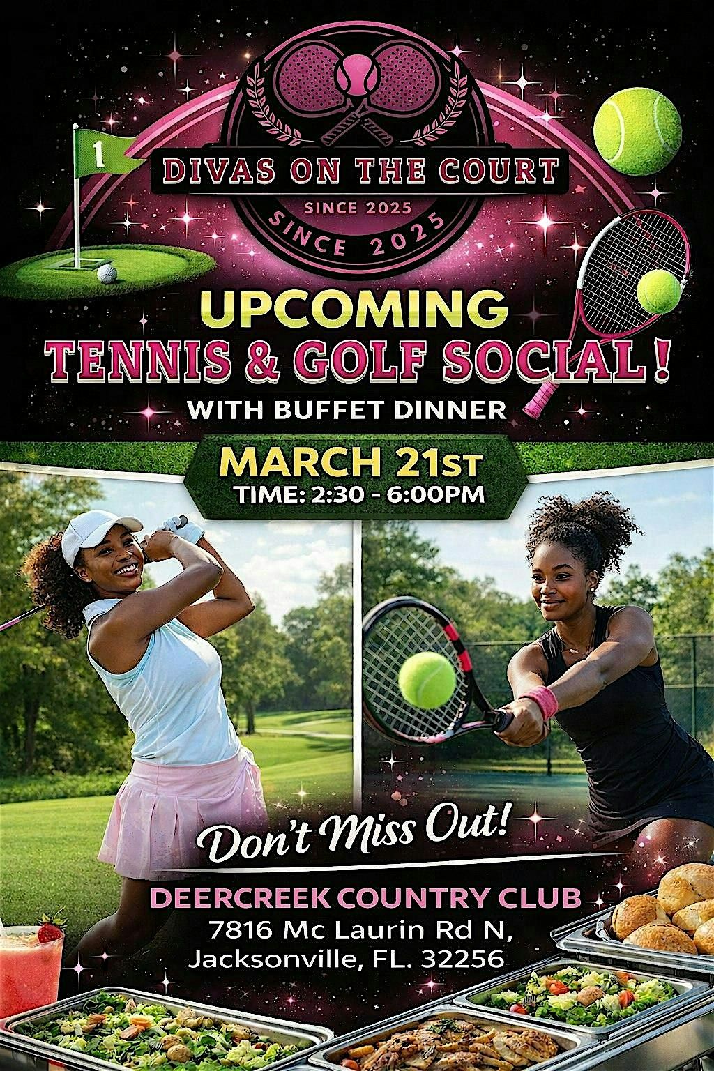 Join us for a fun and welcoming Tennis & Golf Social with Divas on the Court! Beginner lessons will be provided, but all skill levels are welcome. This event is all about learning, connecting, and having a great time.