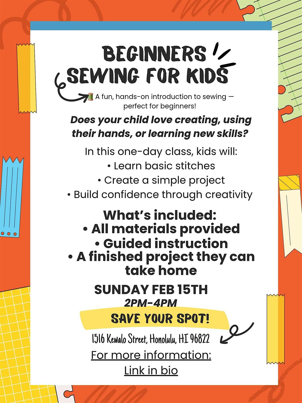 Hands-on beginner sewing class for kids. Simple stitches, creative project, and confidence-building fun. No experience needed.