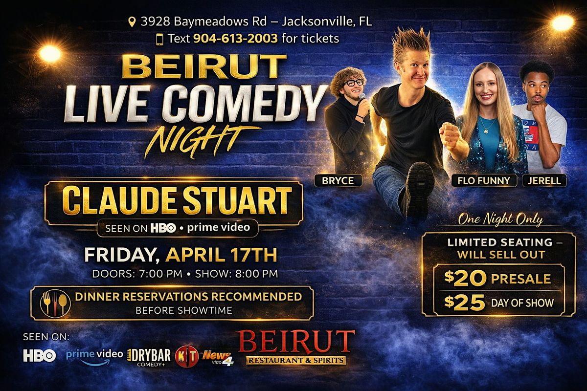 Get ready for a night of high-energy comedy at Beirut Restaurant & Spirits featuring Claude Stuart — seen on HBO & Prime Video and stages like Comedy Zone, Laugh Factory, Improv, and Gotham Comedy Club.