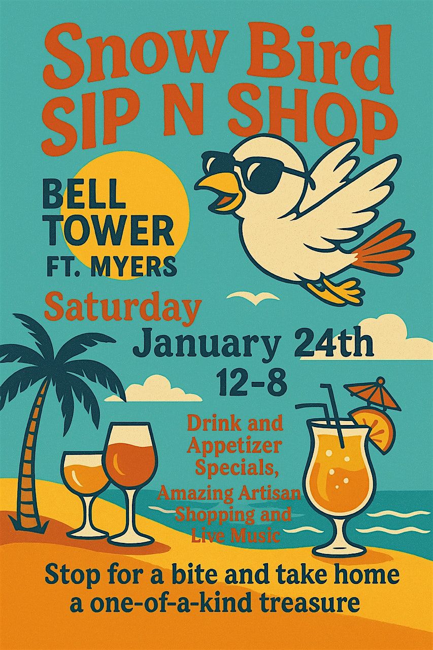 Join us in person for a fun-filled day at Bell Tower's Snow Bird Sip-n-Shop! Sip on your favorite drinks, browse unique shops, and enjoy a relaxed vibe with friends and fellow snow birds. It's the perfect way to unwind and discover some great finds all in one spot. Don't miss out on this laid-back, stylish event designed just for you!