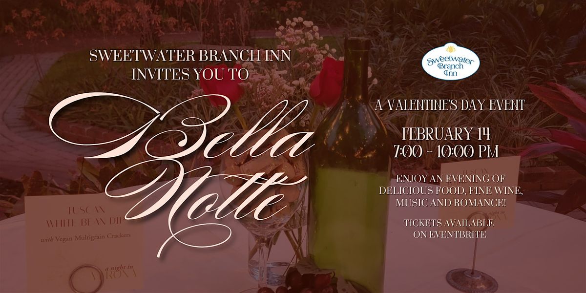 Join us for a night of love and romance at Sweetwater Branch Inn. Our Bella Notte event is the perfect Valentine’s Day night out. Indulge in a delicious dinner buffet with Sweetwater Italian favorites all specially crafted to tantalize your taste buds. Enjoy some delicious wine, relax to romantic music and end your night with a sweet treat from our dessert bar. Join us for a night of pure joy and romance. Let's make this Valentine's Day a night to remember!