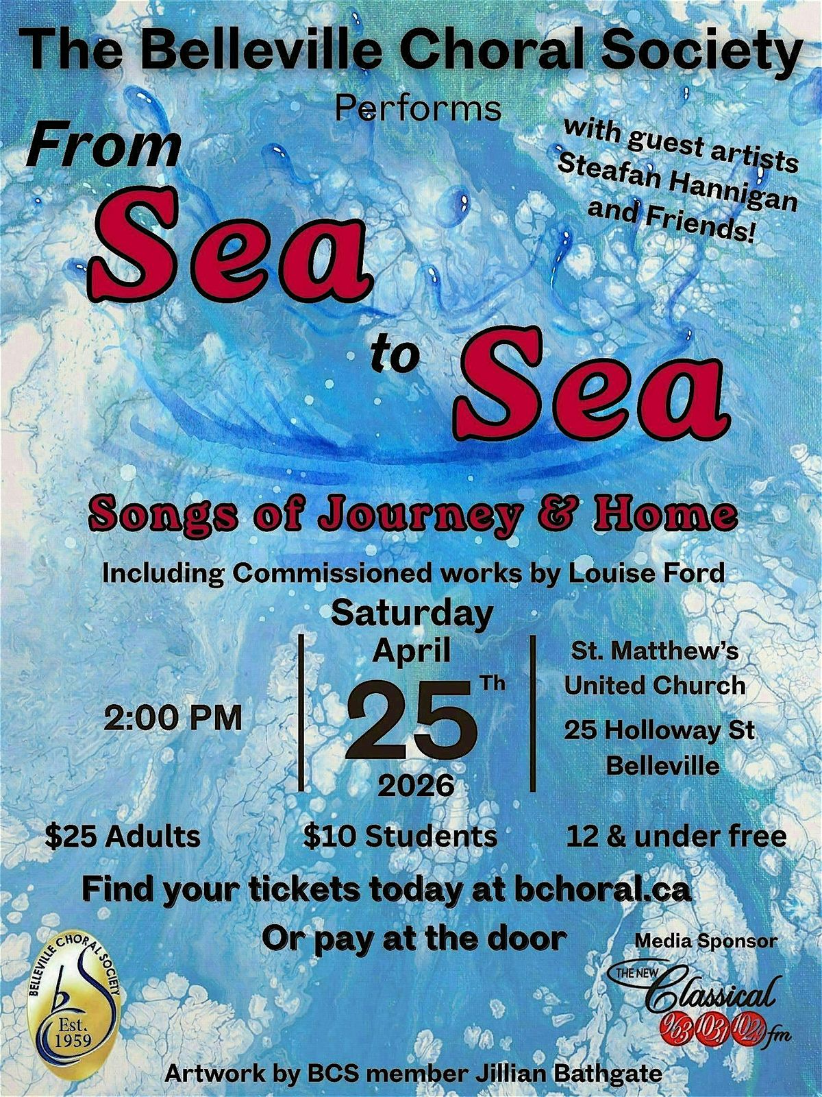 Celebrate the spirit of exploration that rings throughout Canada's history with the 75 voices of the Belleville Choral Society directed by Heather Christiansen and accompanied by Tom Dietzel. Composer Louise Ford has invited local musicians Steafan Hannigan and Friends to accompany her two original compositions and perform a set of their own. With the largest number of members in decades, you'll be impressed with the BCS 'pyramid of sound'. Come and spend a delightful spring afternoon with us.