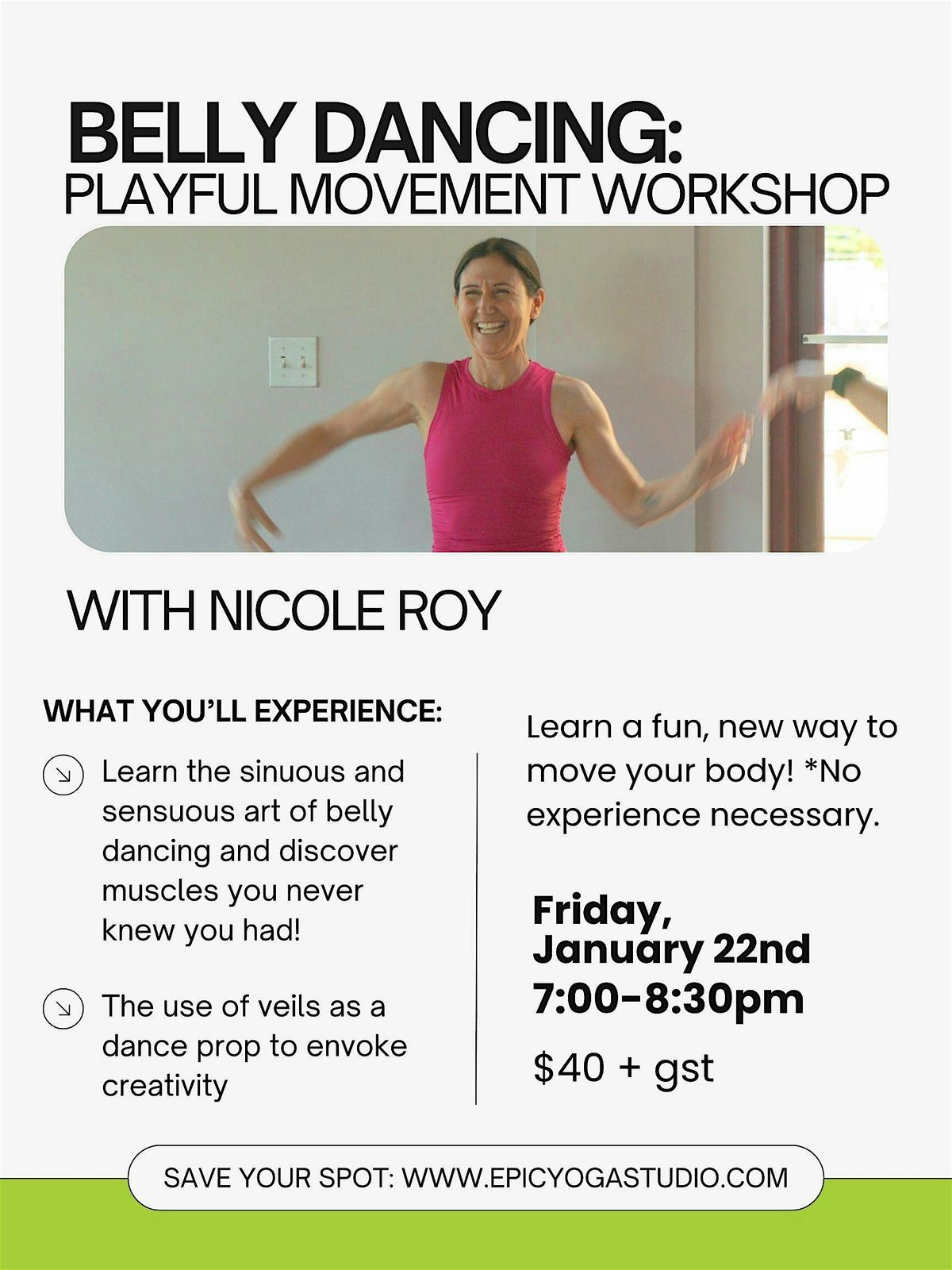 Discover the joyful expression of belly dancing in this fun and approachable workshop with Nicole Roy. We’ll explore foundational belly dance isolations—hips, ribcage, and torso—awakening muscles you may not even know you had. Expect the use of veils as a prop to enhance flow and creativity.