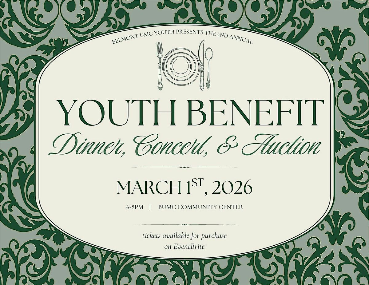 Join us on Sunday, March 1st in the Community Center for our 2nd Annual Youth Benefit Dinner and Concert! With a delicious dinner, auction items donated by phenomenal local businesses, and music performed by students and fabulous friends of Belmont UMC, this will be a night you won't want to miss!