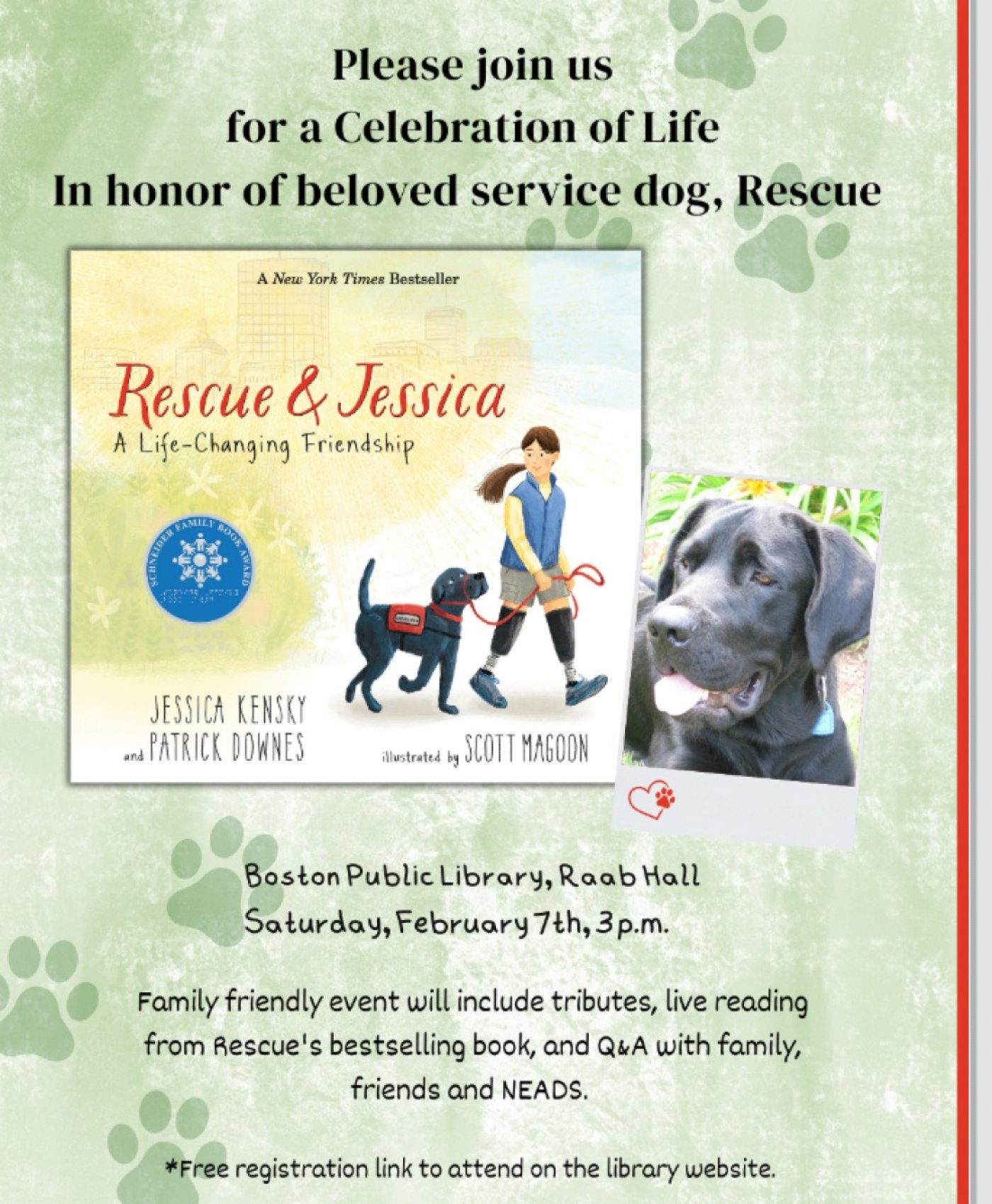 The Greater Boston community is invited to gather at the Boston Public Library in Copley Square on Saturday, February 7, 2026, from 3 to 4 p.m., for a Celebration of Life honoring Rescue, an extraordinary NEADS Service Dog and local hero, whose impact will reach far beyond his years. The family-friendly event is free and open to all ages. Participants can register here.