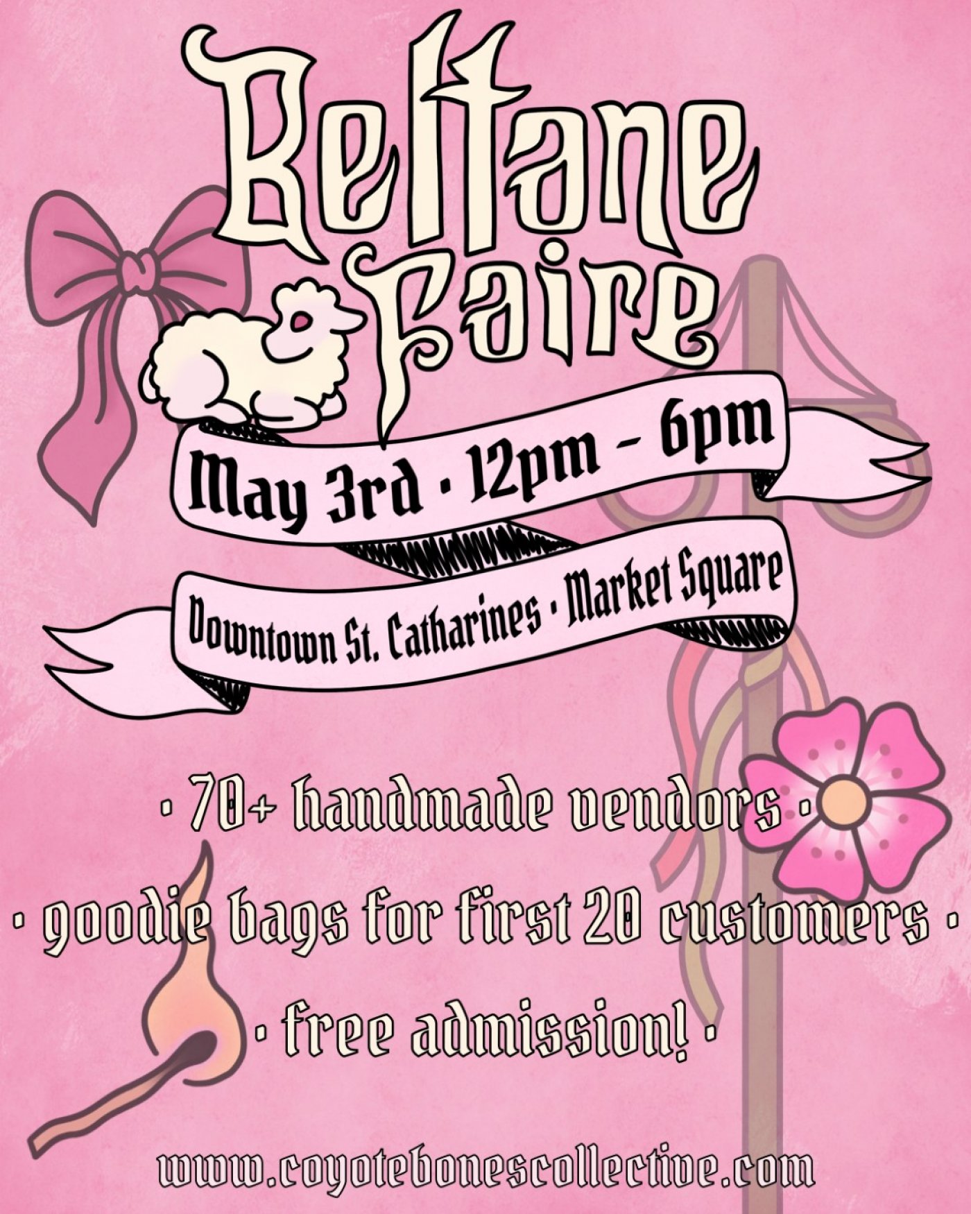 Check out Beltane Faire at Market Square in Downtown St. Catharines on Sunday, May 3 from 12 to 6 PM. Explore 70 incredible vendors featuring makers, artists, crafters, and tarot readers offering unique handmade and independently designed goods. This family friendly event is free to attend and full of seasonal magic, with a community raffle basket and exciting surprises planned throughout the day.
