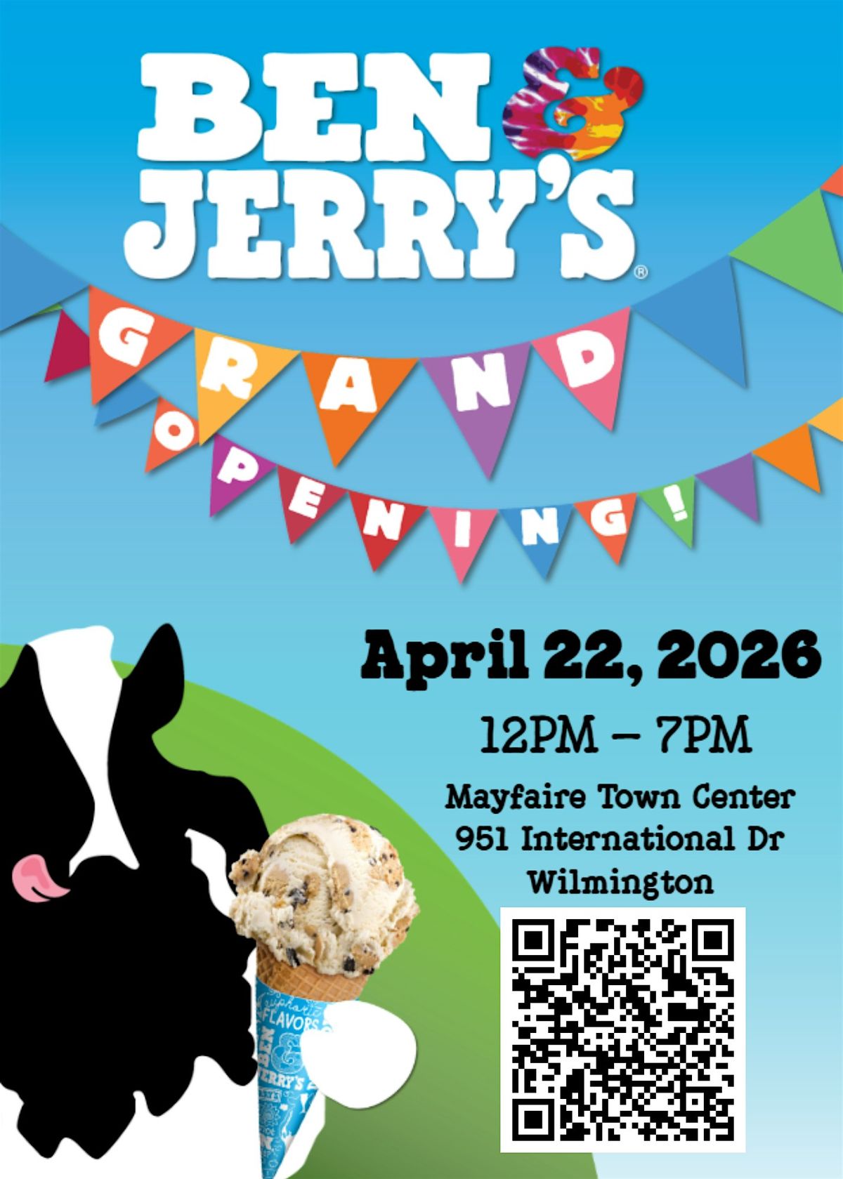 Celebrate the grand opening of Ben & Jerry's in Wilmington! Join us April 22 at Mayfaire Town Center for scoops, fun, and community.
