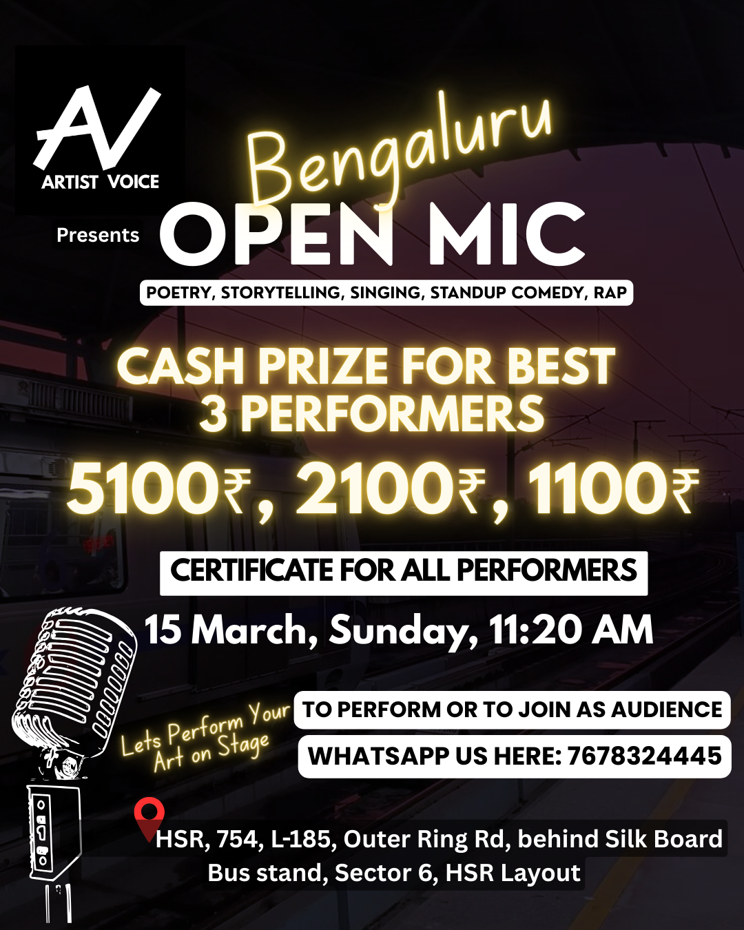 Experience the magic of expression at the Bengaluru Open Mic, hosted by artist voice Join us on March 15, 2026, at 11:20 am at the vibrant HSR Venue, right behind the iconic Silk Board Bus stand in Sector 6, HSR Layout, Bengaluru.