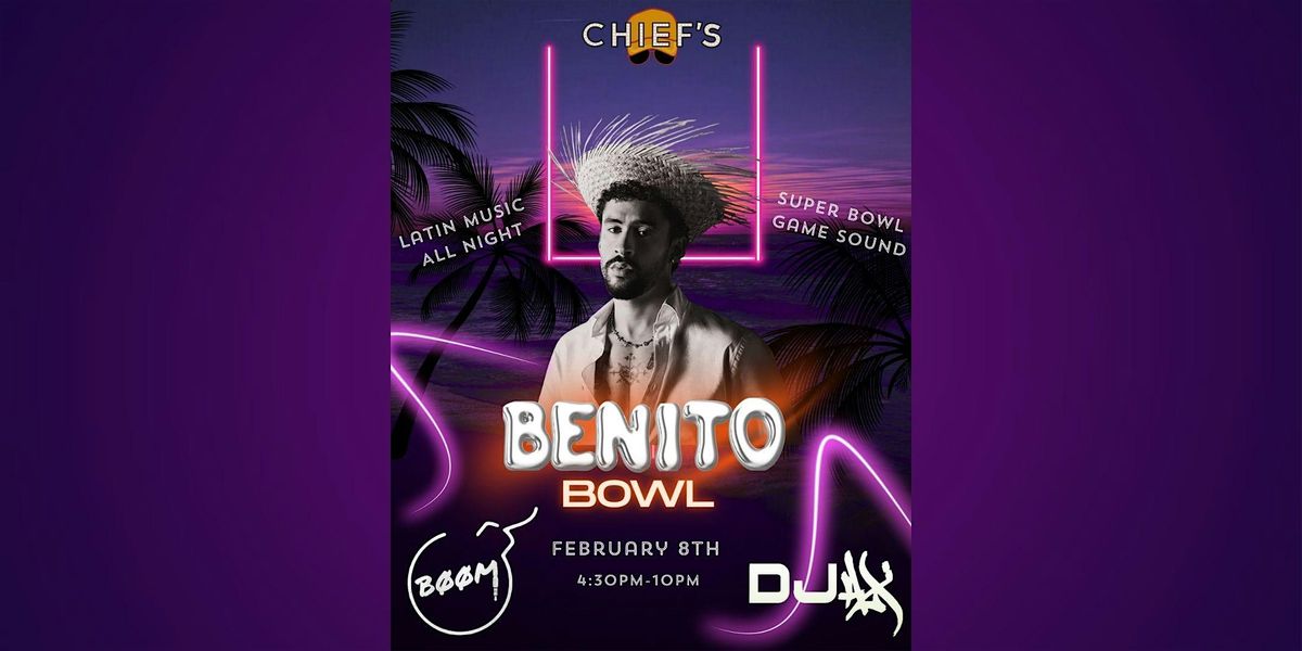 Join us in the Neon Steeple at Chief’s for the ultimate Big Game watch party on February 8th from 4:30–10:00pm. We’re blending football and fiesta for a night featuring Latin music sets by DJs Boom and AX throughout the game.Catch every play with game audio on and the game live on the big screen, while the energy stays high and the music keeps the party going. Whether you’re here for the football, the beats, or the vibes, the Benito Bowl is the place to be for a one-of-a-kind Big Game experience at Chief’s.