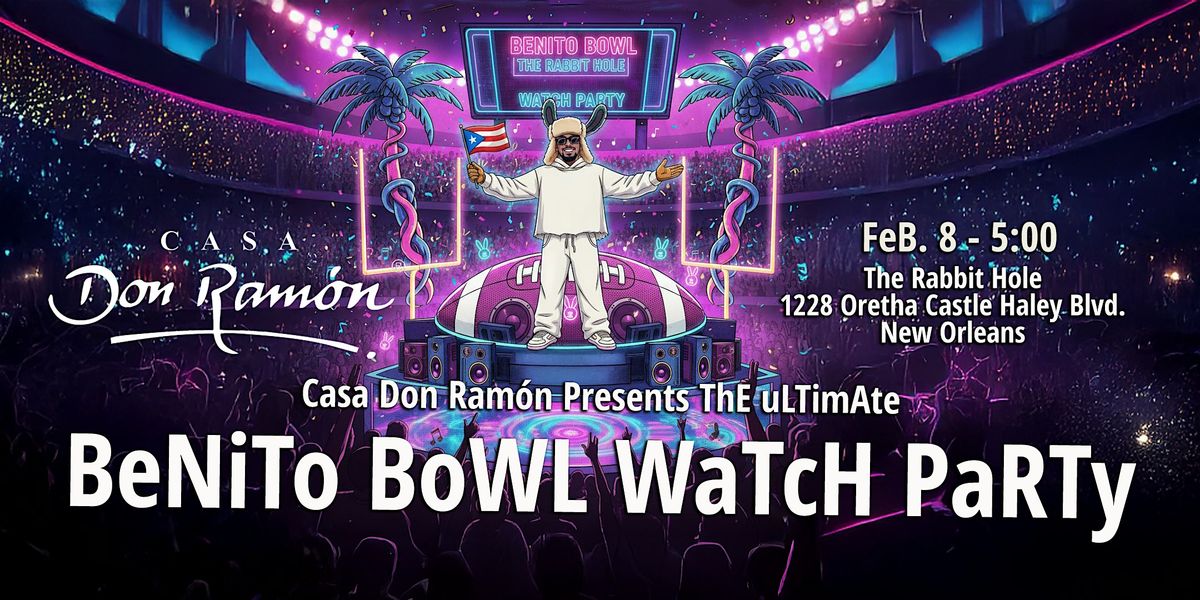 We are celebrating Bad Bunny's performance in the Super Bowl with a party/fest! Enjoy the half time performance and music by DJ Siisko, a live performance by Damian CH, play DoMiNos, DaNCeS, eat FoOd by WASKA and enjoy Casa Don Ramón Tequila sPeciALs. Sure, we will have the big game on, too! Have fun as we celebrate together the biggest music star at the biggest stage at the Ultimate BeNiTo Bowl Watch Party in New Orleans!!!