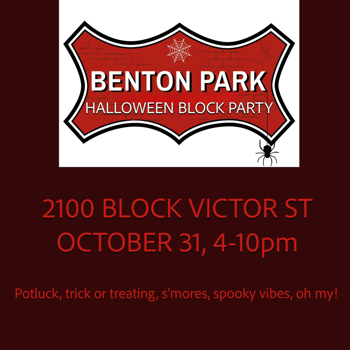 Come join us for a spooktacular Halloween Block Party at 2112 Victor St in Benton Park! Get ready for a night of fun, costumes, and treats. There will be music, games, s'mores, and spooky vibes! Please bring a potluck item to share and a bowl of candy for the kids. Don't miss out on the chance to show off your best Halloween costume and enjoy a festive evening with friends and neighbors. See you there!