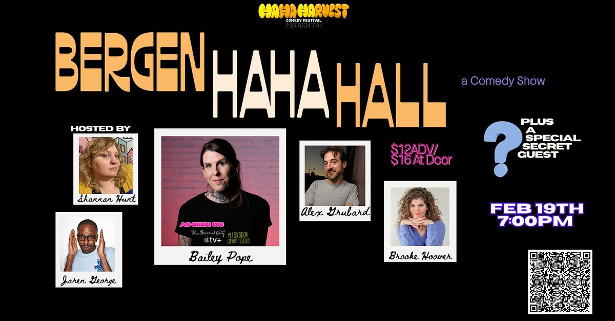 Bergen Ha Ha Hall (presented by Ha Ha Harvest Comedy Fest) brings national-level comedy to an intimate room, headlined by Bailey Pope (Altercation Comedy Festival, Apple TV +, Roku Comedy Channel) a touring comic you usually pay way more to see.