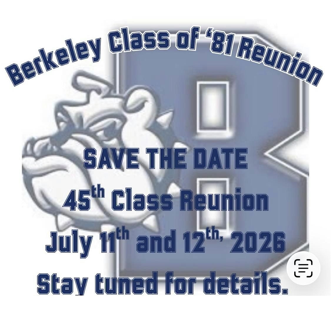 Hey there, Berkeley Sr High Class of '81! It's time to catch up, reminisce, and make some new memories. Join us for an awesome in-person reunion where old friends meet and good times roll. Don't miss out on all the laughs, stories, and fun — let’s relive those high school days together!